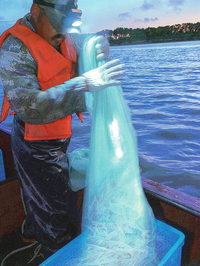 銀魚以水草、浮游生物、小魚小蝦為食,它的繁殖力很強(qiáng),但是“出水就死”,很是嬌貴。所以,不到捕魚現(xiàn)場(chǎng),一般見不著鮮活的銀魚。也正因?yàn)槿绱?,記者凌?時(shí)許就搭乘捕撈船,去拍攝銀魚出水的珍貴瞬間。